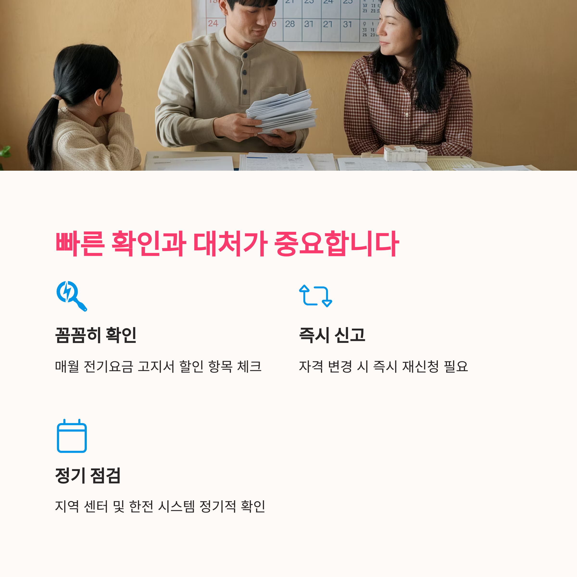 전기요금 복지할인은 자동이 아닌 신청제 + 연동확인제입니다. 누락되는 가장 흔한 원인은 다음과 같습니다.