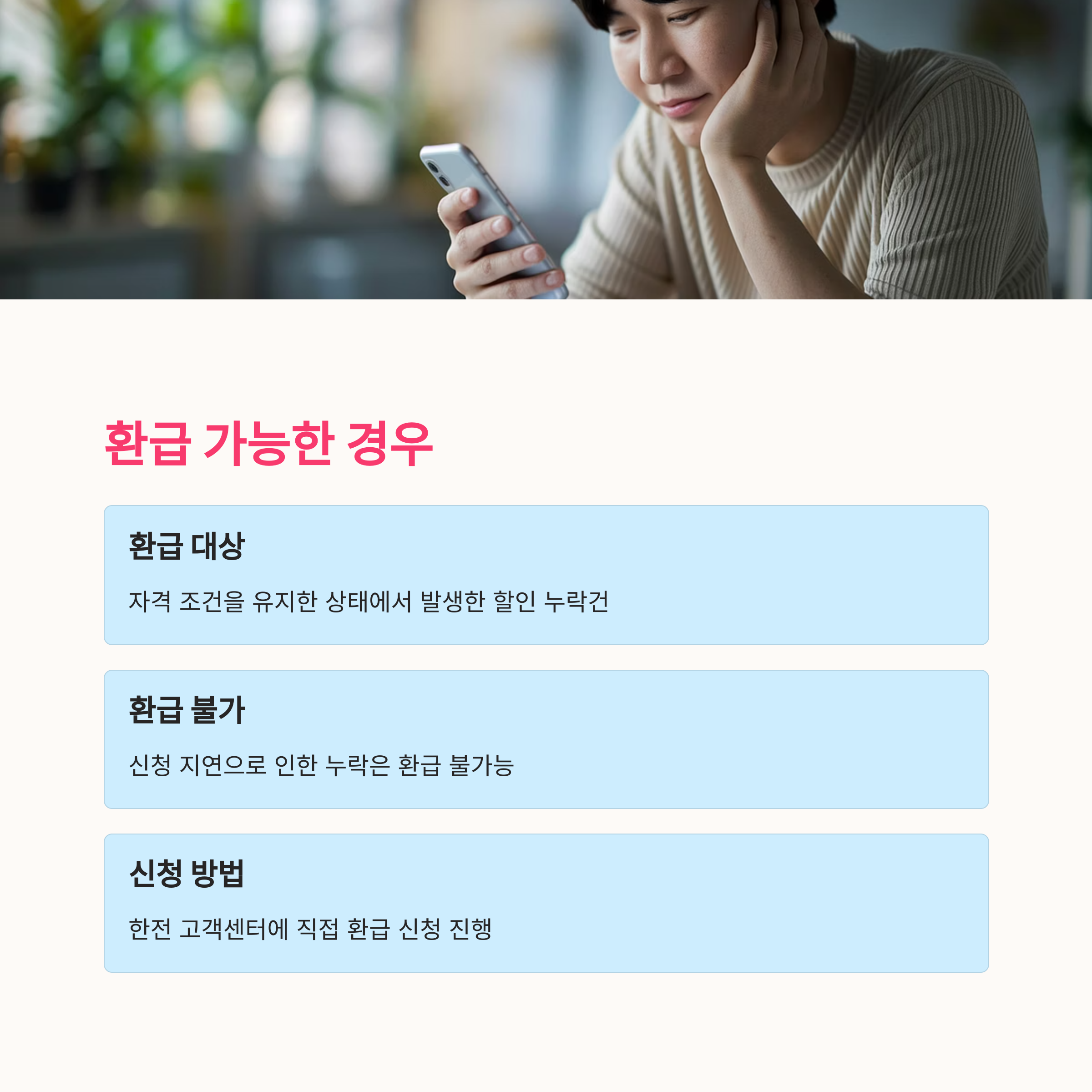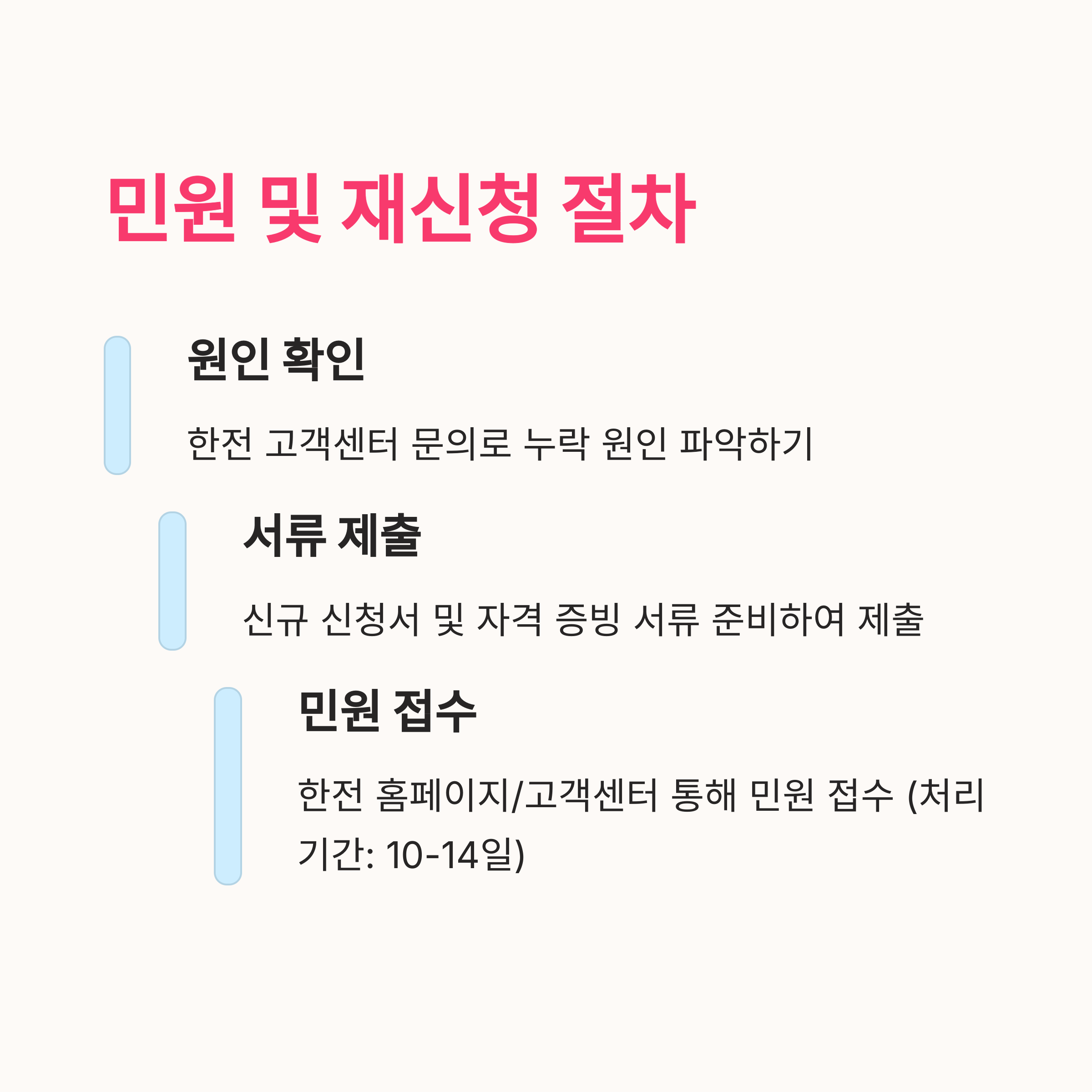 만약 복지할인 대상이 확실한데도 전기요금에 반영되지 않았다면, 아래 절차를 따라 재신청하거나 환급 요청이 가능합니다.