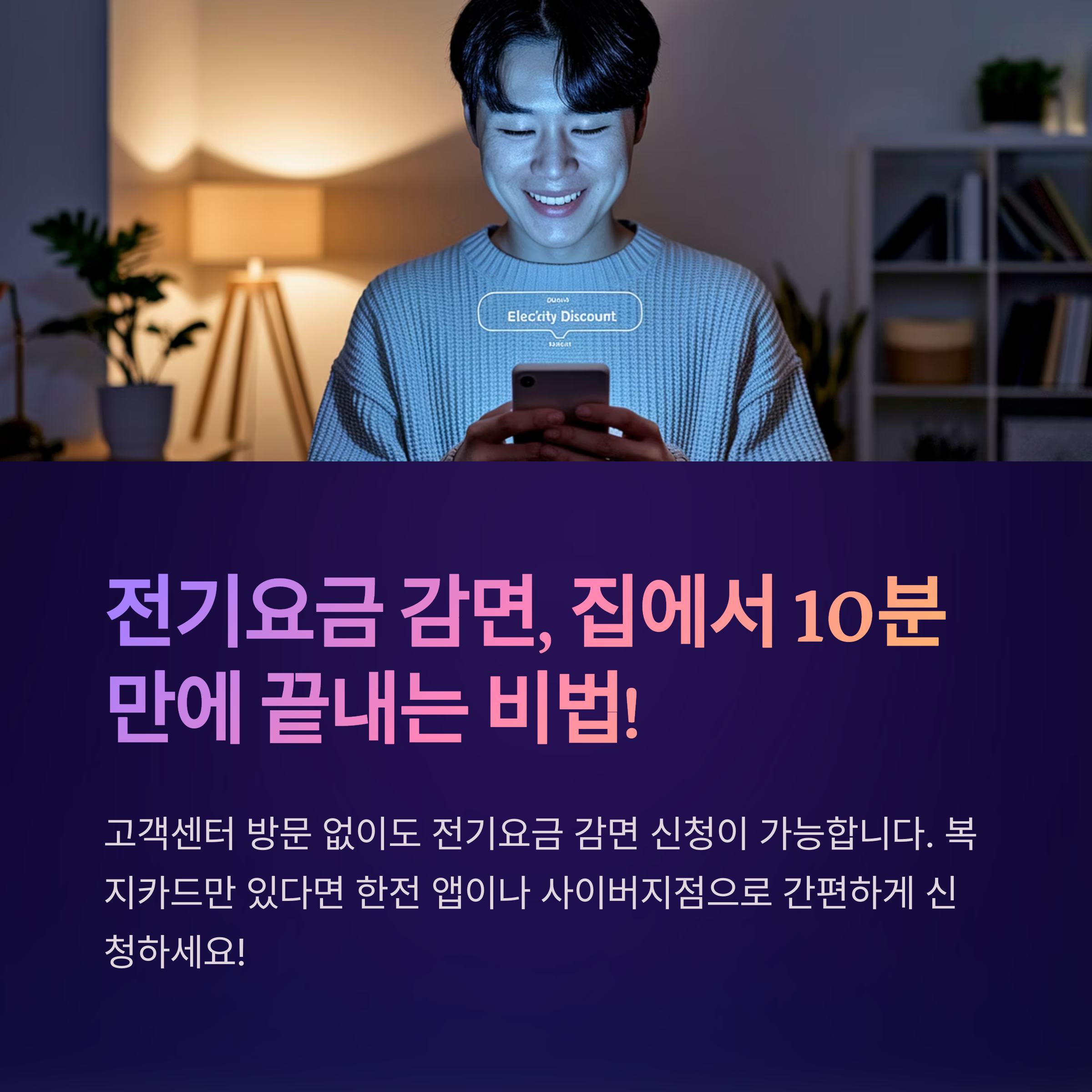 전기요금 감면 신청은 이제 정말 간단해졌습니다. 굳이 한전 고객센터에 전화하거나 방문하지 않아도, 사이버지점 또는 모바일 앱으로 10분 만에 가능하다는 점!