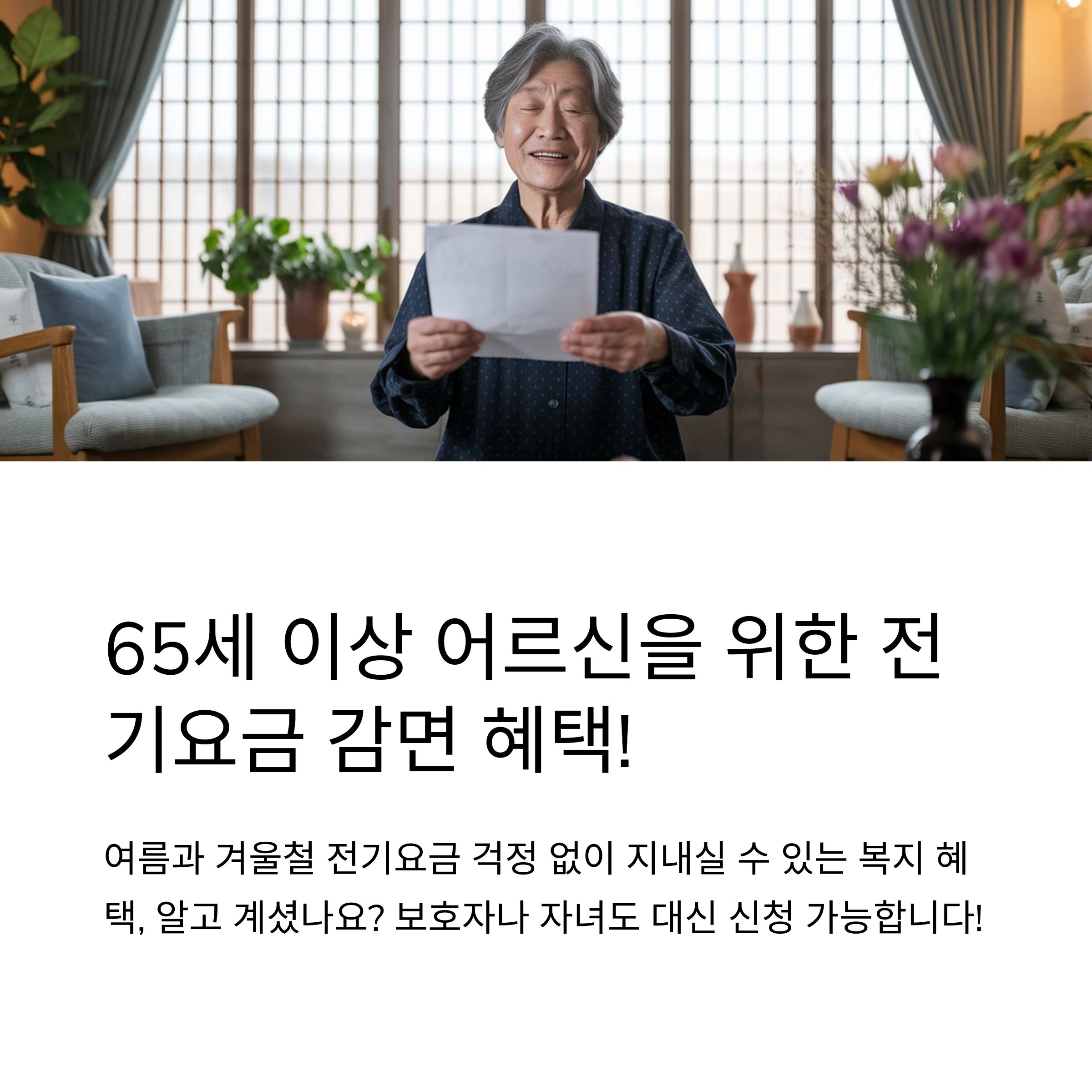 65세 이상 어르신이 받으실 수 있는 전기요금 절약 혜택, 꼭 챙기세요! 조금만 신청하면 매달 수천 원에서 많게는 수만 원까지도 절약이 가능합니다.