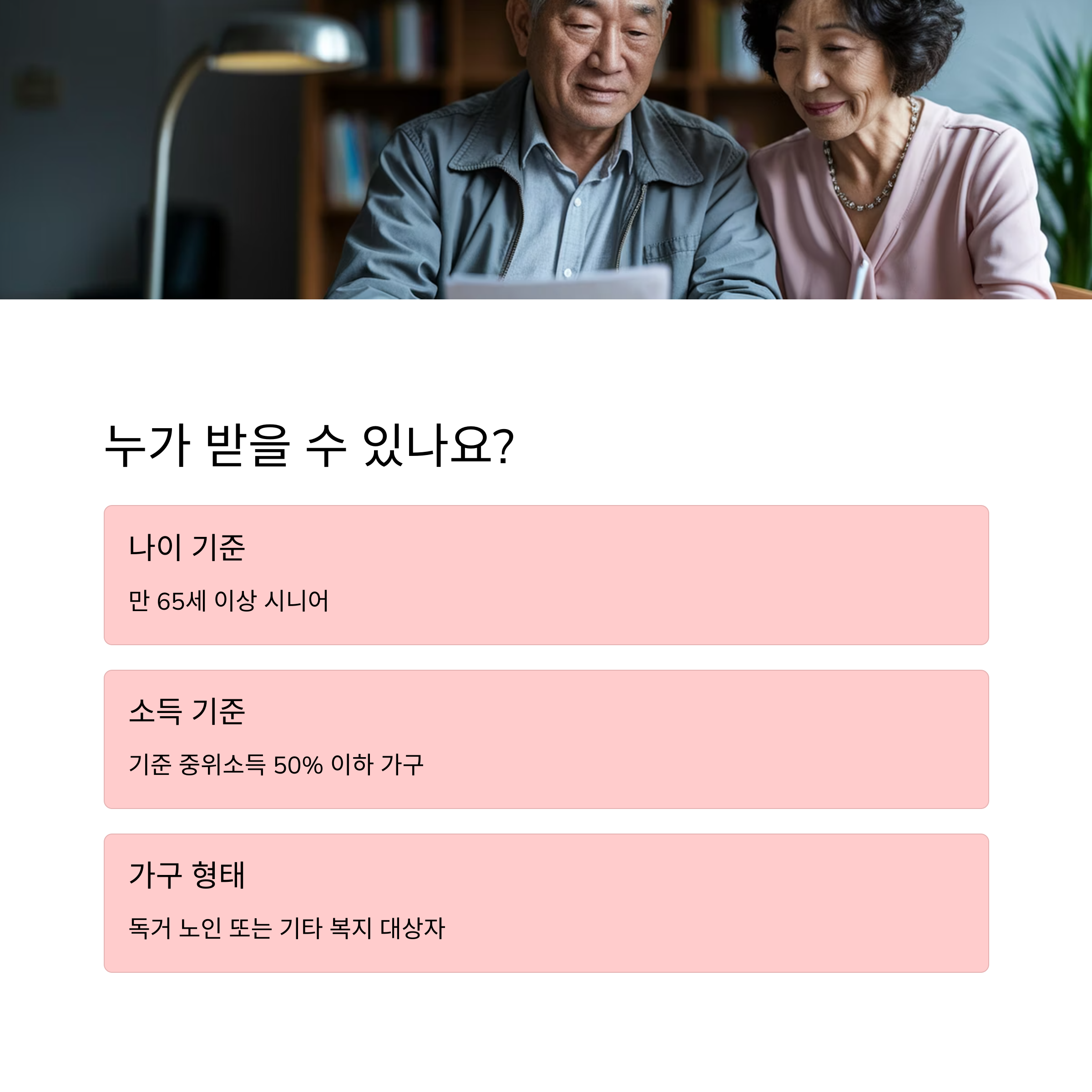 - 만 65세 이상 + 기초생활수급자 또는 차상위계층